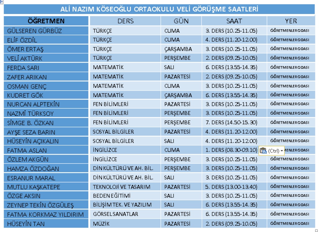 Güncel Veli Görüşme Saatlerimiz tabloda belirtilen şekildedir.